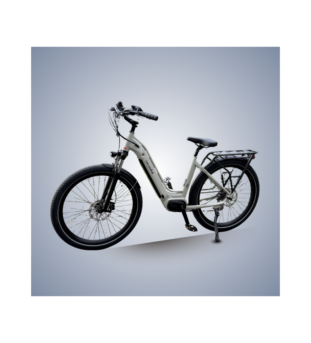 Grâce à son cadre trapèze en aluminium robuste et son design soigné, ce VAE assure une conduite fluide et équilibrée. Sa transmission Shimano 8 vitesses, ses freins à disques hydrauliques 160 mm et sa console digitale intuitivegarantissent un confort et une sécurité optimaux sur tous les trajets.